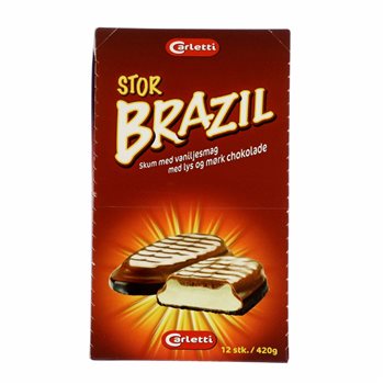Fluffy bløde skumbåde med en delikat vaniljesmag. Brasilien fra den danske slikproducent Carletti er belagt med cremet lys chokolade på toppen og en bund af mørk chokolade. Pakken indeholder i alt 12 stykker. af de store skumbåde til dem, der er særligt sultne efter slik.