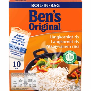 ¡El arroz de grano largo de Ben's Original ™ es perfecto cada vez! ¡Y incluso solo lleva 10 minutos! Hervir en la bolsa también le ahorra la molestia de medir el agua, sin el riesgo de que la quema de arroz. Fuidamos nuestro arroz de grano largo de los campos soleados de España e Italia. Este tipo de arroz es característicamente aireado, no se "pegan" y es al mismo tiempo más robusto que las variedades asiáticas. El sabor y el aroma más neutros lo convierten en un acompañamiento obvio para todo tipo de guisos, en ensaladas y como arroz frito.