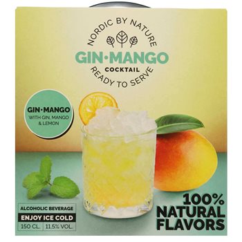 Gin-Mango di Nordic per natura è un cocktail pronto per il servizio che dovrebbe essere goduto ghiacciato con foglie fresche di menta. C'è per ca. 12 occhiali nella confezione. Gin-Mango è costituito da gin, sciroppo di mango e succo di limone. Contiene solo sapori naturali