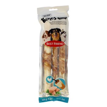 Bone extra grandi che masticano involtini dal migliore amico con ripieno di pollo e involucro di pollo. 3 pezzi. Masticare si attacca che, con rotoli di pelle di mucca, rafforza i muscoli e i denti da masticare del tuo cane prima che raggiunga il gustoso riempimento. Buon intrattenimento per il tuo migliore amico.