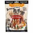 3in1 Stick -uri de mestecat de la cel mai bun prieten sunt mici bastoane gustoase de mestecat din vită și piele de porc învelită cu file delicioase de pui. Barele delicioase sunt potrivite ca bețe de mestecat pentru câini mici și mijlocii și ca o gustare pentru câini mai mari. Geanta conține 20 de calculatoare.
