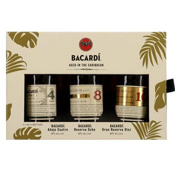 3-pack Bacardi Premium Discovery 40% este pachetul pentru dvs., care ar dori să guste mai multe tipuri diferite de rom Bacardi de calitate pentru a vă găsi preferatul. În pachet obțineți Bacardi Anejo Cuatro Rum, Bacardi Reserva Ocho Rum și Bacardi Gran Reserva Diez. Toate în sticle de 100 ml.